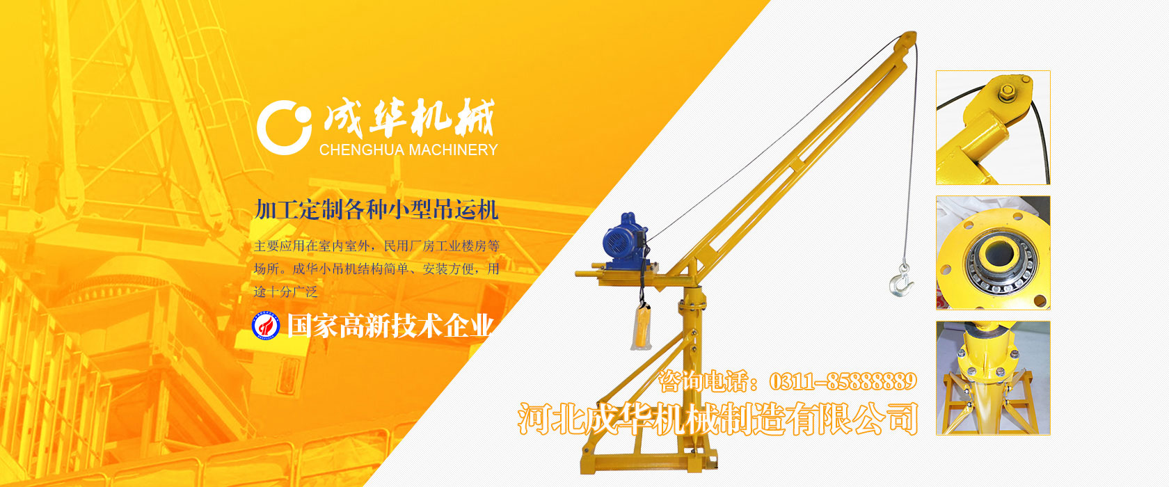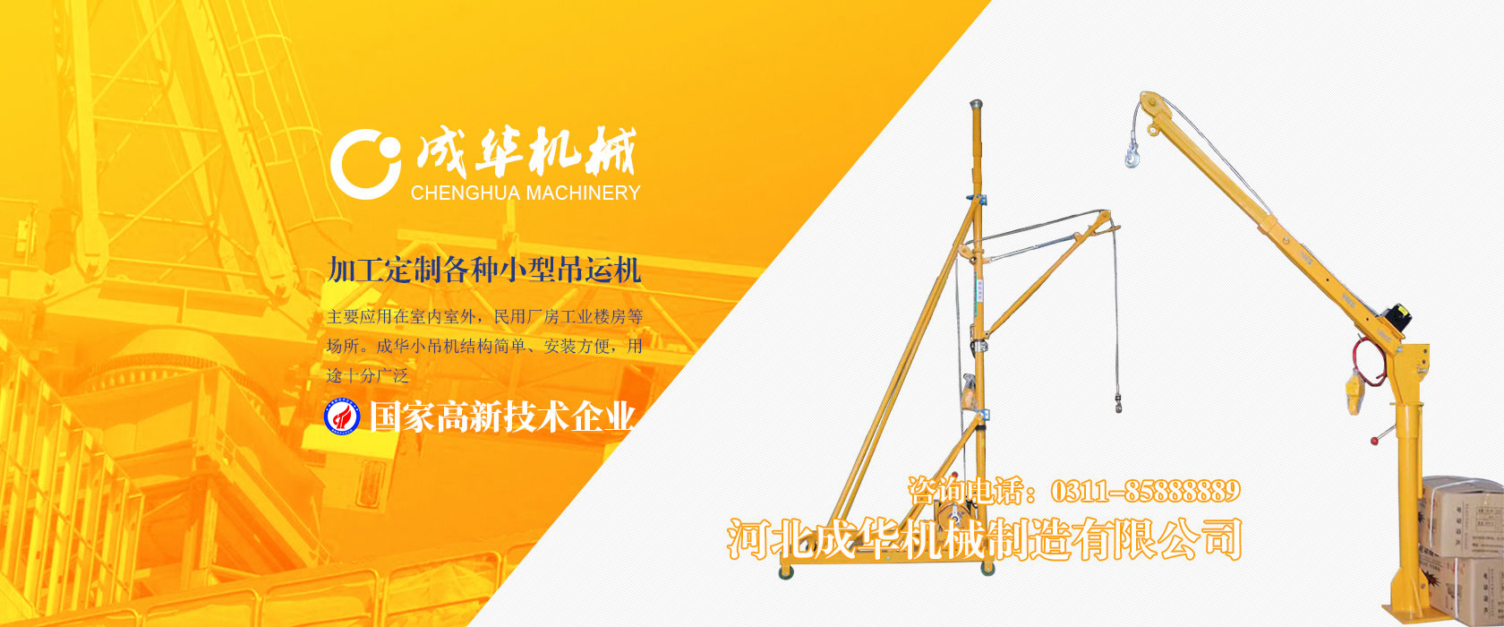 河北成華機械制造有限公司為國家高新技術企業,旗下吊運機制造廠是家專業生產制造便攜式小吊機、手提式小吊機附屬工廠,我廠產品主要應用在室內室外,民用廠房工業樓房等場所。成華小吊機結構簡單、安裝方便,用途十分廣泛,小吊機產品被廣泛應用于機械制造、電子、汽車...